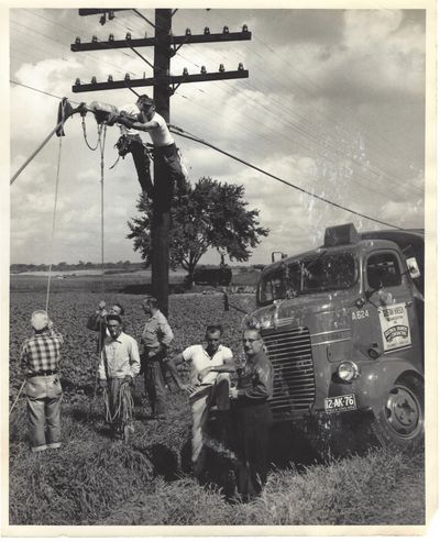 Workmen of the Gustav Hirsch in Columbus, Ohio, install rural electric power lines in 1956.